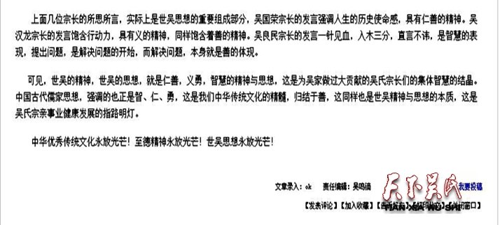【述评】定位很高,高调张扬“世吴的精神,世吴的思想,为吴家做过大贡献的吴氏宗长们的集体智慧的结晶。”世吴为吴家做过大贡献是哪些宗长?捐款多少?修了多少祠堂?建议一一列举岀来让大家敬仰!让大家学习!