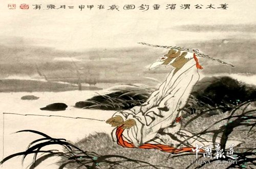 但他不肯贸然拜见,而是设法试探西伯,欲使其前来礼聘。于是便采取欲擒故纵的策略,隐居渭水磻溪,每日直钩垂钓,把鱼钩提离水面三尺以上,而且钩上也不放鱼饵,等待贤君,且作歌曰:“垂钓磻溪乐悠悠,不知冬夏与春秋。那管能钓几条魚,只钓世间君与侯。”这种荒诞(装逼)的举动,果然让姬昌听到后觉得奇怪,便亲临渭水磻溪,走上前充满好奇地问道:“别人垂钓均以诱饵,钩入水中。先生这般钓法,能使鱼上钩吗?”姜子牙见姬昌对人态度谦和,没有一点“西伯”的架子,一看果然是个非凡人物,便进一步试探道:“休道钩离奇,自有负命者。世人皆知纣王无道,可是西伯长子就甘愿上钩。纣王自以为智足以拒谏,言足以饰非,却放跑了有取而代之之心的西伯姬昌。”姬昌闻听此言,大吃一惊。心想:这位老人身居深山,何以能知天下大事?更为不解的是,他怎能把我姬昌的心迹看得如此透彻?肯定不是凡人。便赶紧鞠身施礼,态度诚恳地说道:“愿闻贤士大名?”“在下并非贤士,乃老朽吕尚是也。”“刚才偶听先生所言,真知灼见,字字珠玑,不瞒先生,我就是你说的姬昌。”姜子牙此时才装出一副吃惊的样子,诚惶诚恐地说:“老朽不知,痴言妄想,请西伯恕罪。”姬昌连忙诚恳地说道:“先生何出此言。今纣王无道,天下纷纷,如先生不弃,请您随我出山,兴周灭商,拯救黎民百姓。”随即姬昌同子牙一起乘车回宫,一路上纵论天下大势,口若悬河。姬昌如鱼得水,相见恨晚,回宫之后立即拜姜子牙为“太师”,封其为相,视为心腹。礼聘他为专管军事的“师”,又因吕尚是自己祖父生前日夜想望的人,便又尊称为“太公望”。这便是太公望“姜太公钓鱼愿者上钩”典故的由来。