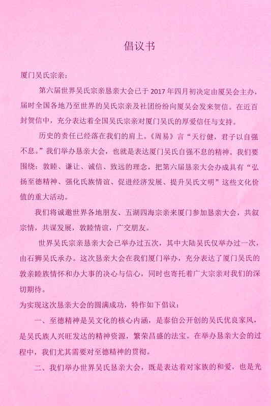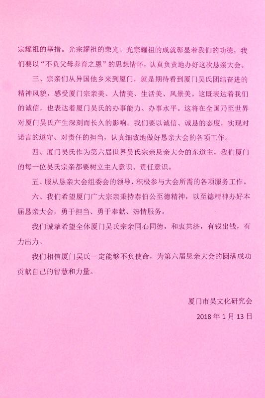 接着由霞浯宗亲会会长吴荣旭、埭头漾公祠宗亲会副会长吴棋南、台湾吴序侬宗长分别作了发言。他们表示积极支持厦吴会的工作、有钱出钱、有力出力、服从安排、听从指挥,积极支持参与在厦门举办的恳亲大会。【厦门市吴文化研究会 2019年1月13日】