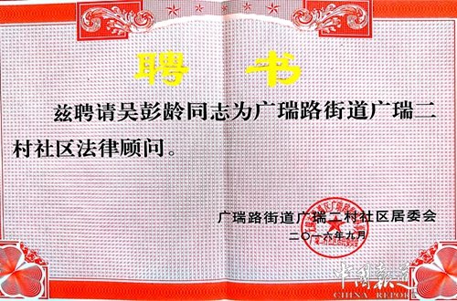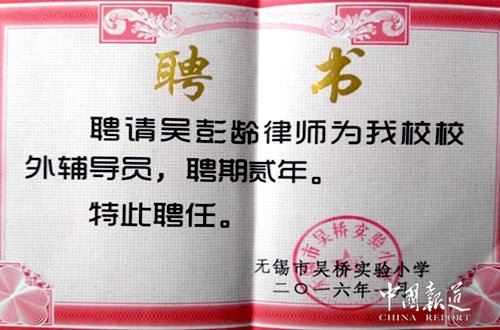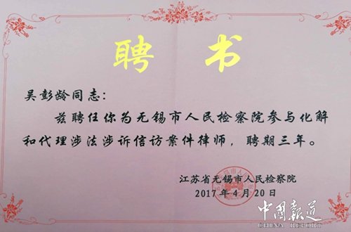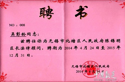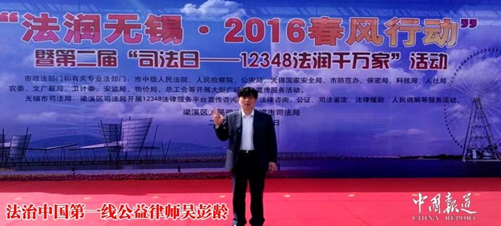 中国报道讯(吴蜀丰江苏报道 特约通讯员陈朴)原标题《吴彭龄:奉献在建设法治中国第一线的优秀公益律师》多次与江苏仁勤律师事务所的一位律师交流谈心。每次总是会遇到他接到电话。其中大都是向他提出法律咨询,而他总是不厌其烦地回答对方。其中一次我们在宜兴,正好用餐时,他接到电话后认认真真地回答对方超过了15分钟,等到结束时饭也凉了。这位老律师认识的人太多,人们可以通过网上多个平台找到他,只要有问,他则必答。他就是不久前被评为无锡市优秀公益律师的共产党员吴彭龄同志。作为公益律师,吴彭龄当然并不是仅仅回答人们提出的法律问题,他眼下担任的各种免费服务的如“天下吴氏网”、“江苏邮轮会”等等资源共享平台法律顾问的“头衔”少说还有10多个。