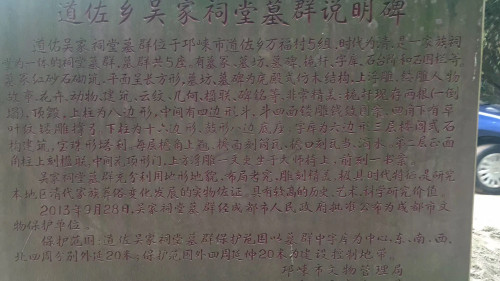 2019年1月16日,应邀来川参加国盾四川省吴氏发展大会的湖北省吴氏宗亲总会吴合林会长、南阳吴氏文化研究会吴忠副会长、广西吴氏宗亲总会吴茂柏副会长、厦门吴氏宗亲总会副会长吴金武、吴槽吴氏宗亲会吴孟秋会长等在四川省吴氏宗亲总会会长吴天智的陪同下,到邛崃市吴大沟和崇州吴槽参观考察了成都市人民政府重点文物保护单位吴氏古大院、吴氏蓝靛坊、吴家古墓群、吴家祠堂、吴氏大家园等,受到了当地党政领导和吴氏宗亲的热情接待……
