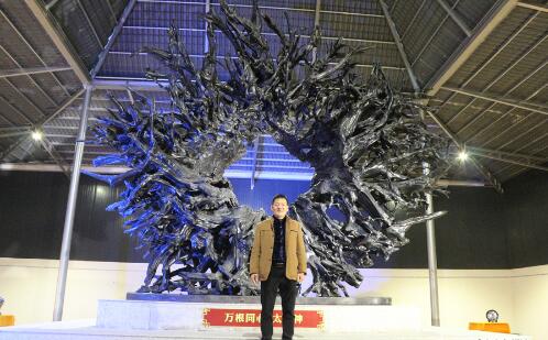 台商卢泓杰与成都乌木艺术博物馆镇馆之宝“万根同心太阳神”。