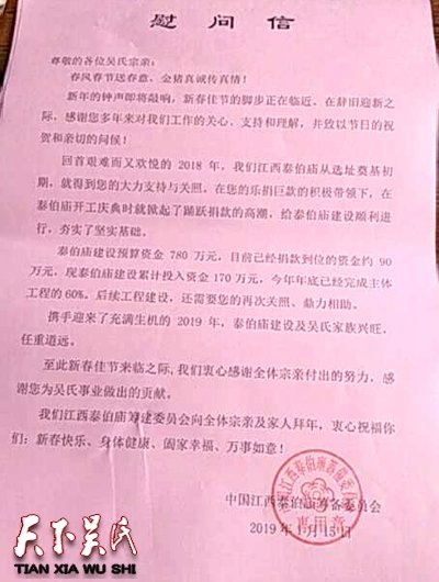 携手迎来了充满生机的2019 年,泰伯精神弘扬及吴民家族兴旺。任重道远,我们真心感谢全体宗亲付出的努力,感谢您为吴氏事业做出的贡献,我们江西泰伯庙管员会向同全体宗亲及家人拜年,衷心祝福你们新春快乐、身体健康、固家幸福、万事如意!