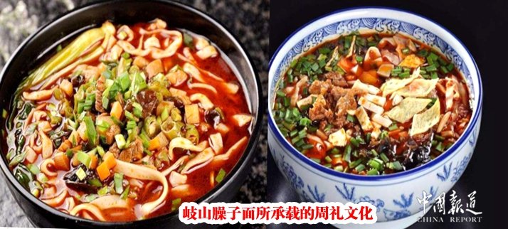 岐山臊子面遐迩闻名,享誉中外,以薄劲光煎稀汪酸辣香为特色,深受人们称道。中央台“舌尖上的中国”也为岐山臊子面做了节目。数千年来,岐山人“过事”(指家里举行婚丧嫁娶等隆重仪式),一定要吃臊子面,其中所体现的周礼文化让人刮目相看。特别是对吃的顺序很讲究。一般而言,先坐席的是亲戚朋友,这也体现了周礼的规范。岐山有句俗话叫“有理不打上门客”,如果别人来你家里做客,即使以前闹过矛盾,不管你多么有理,也一定要尊重对方,给人家给足面子。所以岐山人调和矛盾靠的不是法则,而是礼教,这是一个很大的特色。在酒席上,安排亲戚朋友先吃饭,谁也不会有异议,大家都会自觉遵守。如果这时不该上席的人坐抢先坐在席面上,大家都会笑话他,他也会因害羞而不声不响地退下去。亲戚朋友吃完后,接着招待村上人“坐席”,这便是岐山风俗中“先外后内”原则,先招呼同村人吃饭,最后才能轮到自家人。这种“礼数”,大家都是认可的。
