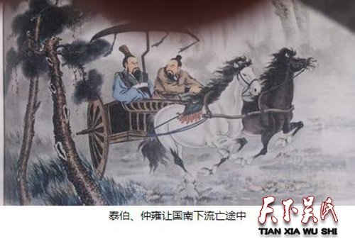 泰伯“三让王位”据《史记•周本纪》载:周太王“古公亶父有长子曰泰伯,次子曰虞仲(仲雍,字熟哉)。太姜生少子季历。季历娶太任,皆贤夫人,生昌,有圣瑞。古公曰:‘我世当有兴者,其在昌乎?’泰伯、虞仲知古公欲立季历以传昌,乃二人亡如荆蛮,纹身断发,以让季历。”泰伯为遂父心愿,破嫡长子继承制之律,将王位让于三弟季历,此为“一让”。