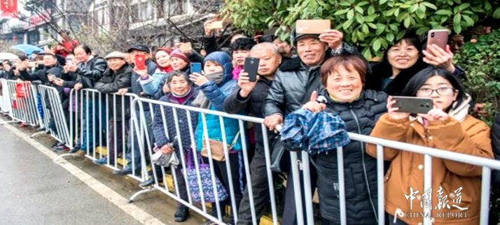在鼓乐声声中龙凤呈祥、高跷抬阁、渔翁戏蚌、江南莲湘,一道道“民俗大餐”惊艳亮相,早早地就等在道路两旁的男女老少纷纷举起手机记录这热闹,传统文化VS国际友人,在浓浓的传统文化氛围之中,6位国际友人组成的老外粉丝团格外抢眼也当之无愧地成了众人争相拍照的“吉祥物”,他们手持“福”字和对联不停地向人群挥手致以中国农历新年的问候,大伙儿也都热情地回应着:“Hi~”“HELLO!”Amy & Roger (美国):我们正在中国旅行,1个月前来到无锡。能在这里度过中国新年,参加这样盛大的庙会太兴奋了!它将会成为我们中国之旅中的独特记忆!黑人小哥:这不是我第一次参加中国的庙会,但是梅村这里的特别隆重、活动特别多!我很高兴参加了舞龙舞狮的舞蹈,还了解到很多有关泰伯和中国传统的东西,非常棒!一行人看得正入迷Roger突然跪在地上。