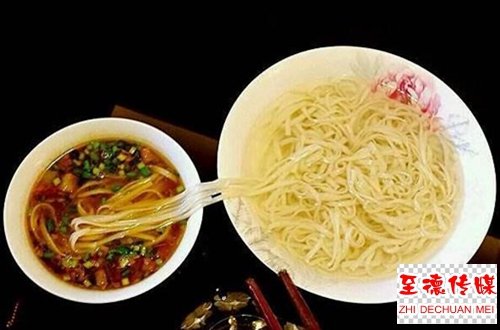 吃蛟汤面时的所谓“不喝汤”,就是将汤回转在畅口的铁锅中煎滚,高温杀毒灭菌,使汤中的调和更加衔接咬合,汤的香味回味无穷。只吃面不喝汤后来成了岐周人待客的约定成俗。客食数十碗乃百,足以见主人待客之诚心。吃浇汤面的要害是品尝汤汁的味道,每碗面条仅仅一筷头,汤汁一定要淹没面条,就是要“吃”汤,而非吃面。这种仪式,传承着岐周大地上来自周公制礼的贵族风范。岐周之地上的人吃蛟汤面的那一种优雅、得意,溢于言表,当把面条挑在筷头,头微微一偏,“呲溜”一声,一口一碗,端面人还没转身,碗中早已无面条,嬉戏声不绝于耳,和谐气氛弥漫庭院。
