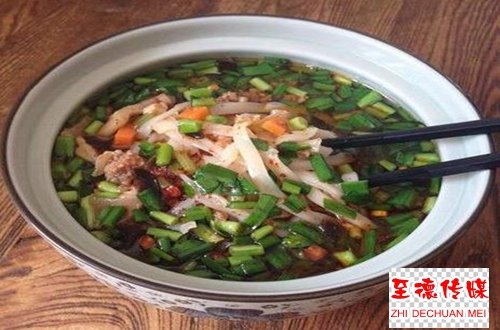 吃蛟汤面时的所谓“不喝汤”,就是将汤回转在畅口的铁锅中煎滚,高温杀毒灭菌,使汤中的调和更加衔接咬合,汤的香味回味无穷。只吃面不喝汤后来成了岐周人待客的约定成俗。客食数十碗乃百,足以见主人待客之诚心。吃浇汤面的要害是品尝汤汁的味道,每碗面条仅仅一筷头,汤汁一定要淹没面条,就是要“吃”汤,而非吃面。这种仪式,传承着岐周大地上来自周公制礼的贵族风范。岐周之地上的人吃蛟汤面的那一种优雅、得意,溢于言表,当把面条挑在筷头,头微微一偏,“呲溜”一声,一口一碗,端面人还没转身,碗中早已无面条,嬉戏声不绝于耳,和谐气氛弥漫庭院。
