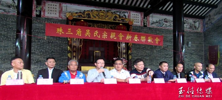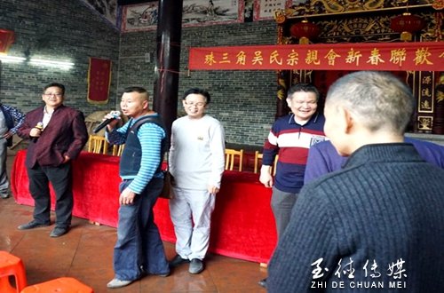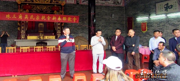 参观丽岗新村完毕后,广东珠三角吴氏宗亲会新春联欢会暨珠三角吴氏宗亲会领导班子会议在肇庆丽岗村吴氏宗祠进行举行,大会由吴昌禄宗长主持,首先由吴秋良书记作讲话,他代表丽岗村对珠三角吴氏宗亲前来丽岗新村参观表示热烈的欢迎,介绍了丽岗新村新农村建设情况。介绍了丽岗村吴氏宗祠建设的历程,秋良书记说:丽岗村吴氏宗祠于2013年兴建,丽岗村的村民力经艰辛、多方筹集了资金260多万元兴建了现在这座丽岗村吴氏宗祠,成为弘扬吴氏家族崇德向善集吴氏名人堂、吴氏来源、吴氏家训、农家书屋一体的道德教化和文化教育功能的基地。接着:广东珠三角吴氏宗亲会会长吴锦添通报了参加在江西萍乡参加中华吴氏第11届恳亲大会的情况,通报了他在中华吴氏第11届恳亲大会上接过了“承办中华吴氏第12届恳亲大会”的大旗,表示将成立中华吴氏第12届恳亲大会筹备小组,希望珠三角吴氏宗亲团结一致,齐心合力,全力做好这次承办工作,争取将中华吴氏第12届恳亲大会办得圆满成功。最后是,常务副会长吴建忠、吴占标讲话。吴占标会长讲话结束后,参会的深圳、广州、东莞、惠州、珠海、江门、中山、肇庆、清远、英德、广西容县、广宁、丽岗村吴氏宗亲等代表先后进行了发言。
