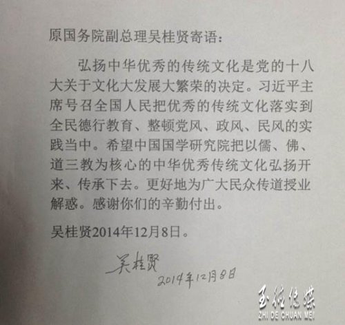 吴桂贤的一生,正是新中国革命史、建设史最典型的写照。吴桂贤80岁的时候,还率领全国各地的吴氏宗亲约500人在深圳龙华光浩国际中心举办隆重的纪念毛主席活动。作为毛泽东思想永放光芒纪念会会长的吴桂贤,亲笔题字:永远跟着党走,世世代代高举毛泽东思想伟大红旗!