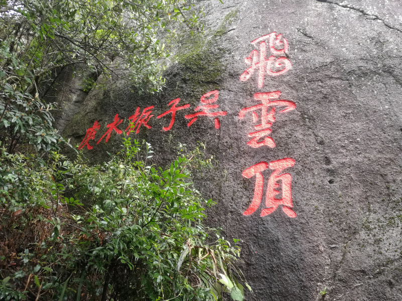 罗浮山玉女峰下,有燕子岩,自燕子岩至伏虎岩(鹰嘴岩)约5里,皆斩崖为路,下临深溪,怒石逼仄,迤逦不绝,伏虎岩(鹰嘴岩)旁有岩壁刻,博罗县令吴日强在此书:“飞云顶”、“吴子振衣处”。据称此地并非飞云顶,因刻石石匠见山陡路峭难以攀登,避难就易,故将“飞云顶”三字刻于此处。