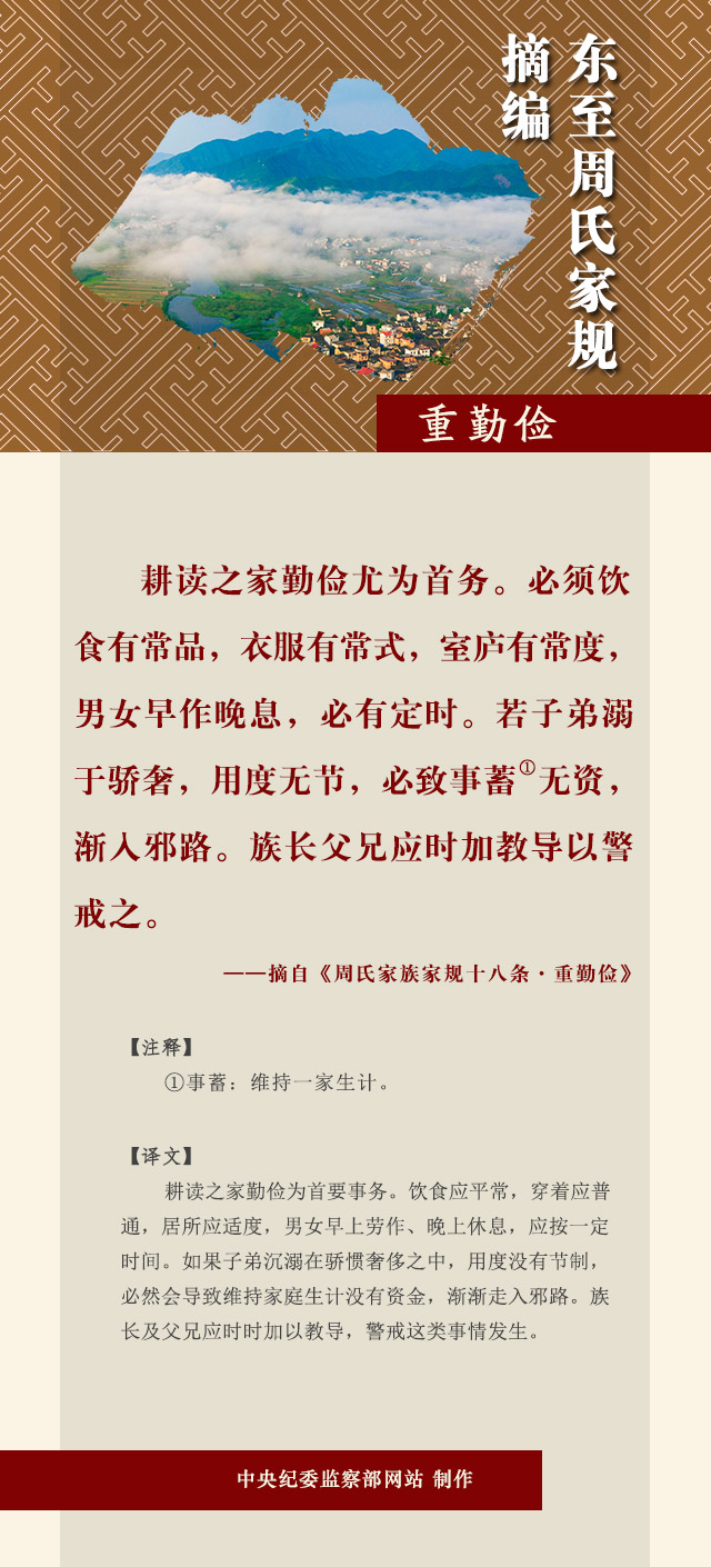 耕读之家勤俭尤为首务。必须饮食有常品,衣服有常式,室庐有常度,男女早作晚息,必有定时。若子弟溺于骄奢,用度无节,必致事蓄①无资,渐入邪路。族长父兄应时加教导以警戒之。