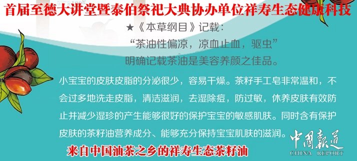 特别感谢南平市祥寿生态健康科技有限公司董事长吴祥明为2019年新时代首届至德大讲堂暨泰伯祭祀大典赞助价值12800元健康生态茶籽油、茶籽粉、茶籽面膜、茶籽手工皂系列产品。