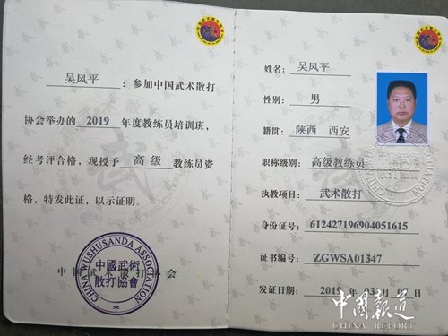 近日,经过中国武术散打协会严格培训,并经考核与评定,吴风平院长被授予中国武术散打“高级教练”资格,圆了他的武术梦。