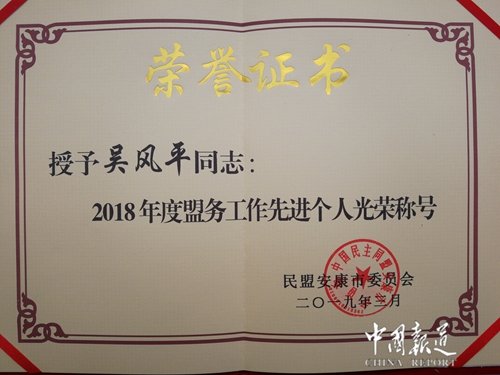 民盟安康市委授予“吴风平为“2018年度盟务工作先进个人”称号。会议强调,2018年,民盟安康市委以“坚持和发展中国特色社会主义学习实践活动” 和“不忘合作初心,继续携手前进”专题教育为主线,坚持正确政治方向,教育引导广大盟员牢固树立“四个意识”,坚定“四个自信”,思想建设取得突出成效;紧扣市委市政府中心工作,围绕“绿色崛起、追赶超越”发展战略和建设西北生态经济强市目标,认真履行参政党职能,围绕“生态建设、旅游产业、脱贫攻坚、教育民生、科技卫生”等领域突出问题积极开展调查研究,积极建言献策;发挥优势,扎实开展社会服务工作,积极参与打赢脱贫攻坚战,深入开展民主监督,建立精准帮扶长效机制;确立思想建盟、制度管盟、履职立盟、人才强盟的工作导向,不断提高“五种能力”,努力建设高素质的中国特色社会主义参政党。