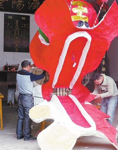 据江师傅介绍,今年中堡大龙有68节,约300米长,正月初四、初五,他们就备好龙板、竹篾筋骨、宣纸等,以后一直忙着制作。“最重要的是龙头,3米多高、7米长,龙口内含大红龙珠,龙身则是家家户户自行制作。”江师傅说,还要备好龙棍、插袋布等,最终制成“姑田大龙”。前后整个制作过程约需10天。