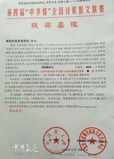 在近八千位参赛者中,大多为各级作协、诗词协会会员,有很多资深的作家、散文家、诗人等,高手云集。吴家海为业余作者,没有任何名头,连县级作协会员都不是,能获此名次实属不易。