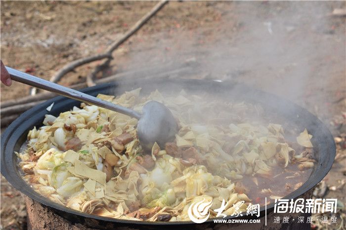 中午十一点多,饭菜陆续出锅,年轻人端菜,年龄大的围坐在一起聊天喝茶,准备吃饭。饭菜也很简单,一个桌六个菜,“大厨”吴培敬还为大家准备了炖菜,每人一碗。“咱是农民,最能知道粮食来之不易,一人一碗菜,不铺张浪费。”吴培敬说。