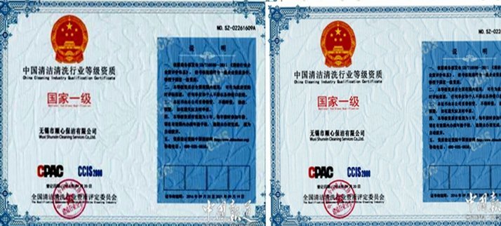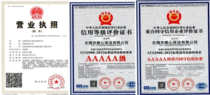 “以心血炼精品,以人品铸品牌”!13年来,顺心保洁先后通过了“道路运输经营许可证”、“从事城市生活垃圾经营性清扫、收集、运输服务许可证”、“ISO9001质量管理体系认证”、“ISO14001环境管理体系认证”、“ISO18001职业健康安全管理体系认证”、“安全生产标准化三级”、中清协“国家一级证书”、并荣获天长市争创全国文明城市“突出贡献单位”、“重合同守信用AAAAA企业、信用等级认证AAAAA企业、质量服务诚信AAAAA企业”、“无锡市重合同守信用企业AAA级”、江苏省广播电视总台“江苏省优质服务品牌”、“最具责任感优质服务单位”、“江苏省优秀诚信服务单位”、江苏企业网“江苏最具实力诚信企业”、等各项荣誉证书,以卓越的业绩和信誉创建了顺心品牌。