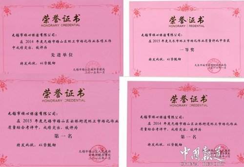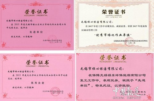 “以心血炼精品,以人品铸品牌”!13年来,顺心保洁先后通过了“道路运输经营许可证”、“从事城市生活垃圾经营性清扫、收集、运输服务许可证”、“ISO9001质量管理体系认证”、“ISO14001环境管理体系认证”、“ISO18001职业健康安全管理体系认证”、“安全生产标准化三级”、中清协“国家一级证书”、并荣获天长市争创全国文明城市“突出贡献单位”、“重合同守信用AAAAA企业、信用等级认证AAAAA企业、质量服务诚信AAAAA企业”、“无锡市重合同守信用企业AAA级”、江苏省广播电视总台“江苏省优质服务品牌”、“最具责任感优质服务单位”、“江苏省优秀诚信服务单位”、江苏企业网“江苏最具实力诚信企业”、等各项荣誉证书,以卓越的业绩和信誉创建了顺心品牌。
