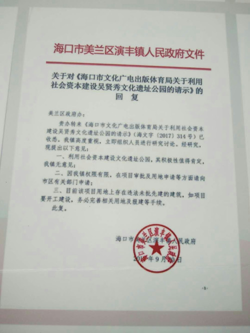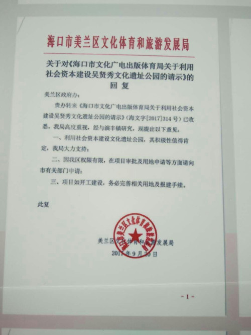 乙亥猪年,春暖花开。又是一年清明扫墓时,欢迎您及家人回来祭祖!琼藉海内外吴氏宗亲的血脉感恩之地,海南吴贤秀文化遗址公园项目,筹建工作正在有条不紊推进中。两年多来,在海南省吴贤秀文化教育基金会理事会的领导下,经海南省吴贤秀文化教育基金会申报获海南省民政厅、海南省文物局、海口市人民政府、海口市文体局、海口市国土资源局、海口市规划局和海口市美兰区政府、演丰镇政府的重视与支持,“海南吴贤秀文化遗址公园”已基本获得用地,建设以及建成后管理的批准,该遗址公园用地由政府划拨,用地范围内的文物保护,环境营造,园林绿化以及必要的纪念,展示附属设施由基金会出资解决,并按文物,规划,建筑和园林有关的法律法规履行报建手续,建成后公园免费对外开放。渡琼先祖吴贤秀墓地已于2015年被列为海南省重点文物保护单位之一,在此基础上,该项目选址符合并体现《海口市总体规划(空间类2015-2030)》“多规合一”成果,该项目占地面积66.6亩,包括吴贤秀墓在内,为保护海南优秀文化遗产,营造良好的文物保护环境,促进吴文化发展,将建设海南吴贤秀遗址公园。