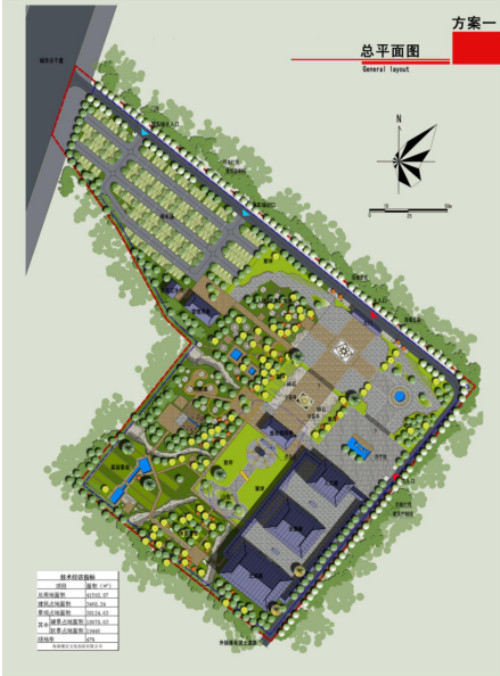 4. 铸造陵墓后枕山丘、祠堂前方明塘,规划用地犄角处安排六角、八角亭点缀制化。