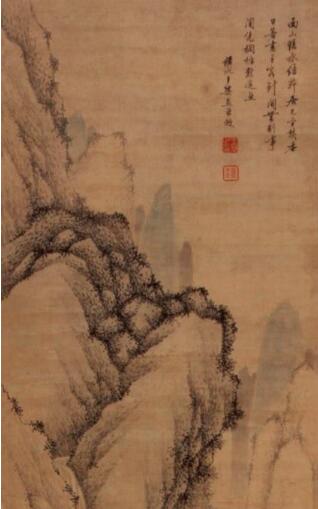 绢本设色,纵201.5、横48厘米。此幅构图饱满,主次分明,笔致苍劲,气韵深厚。画面富有层次,上面为层峦叠嶂,气势恢宏;下面是林木茂盛的山谷,山谷中有凉亭一座,茅屋两三间,小桥和溪流,桥上的人与屋中的人在交谈,有诗有画有故事。右上角有题跋:面山临水结茅居,兀坐焚香日著书。有客到间无别事,闲凭栏楯数游鱼。秀水王概画并题。钤白文方印“王概之印”,朱文方印“安节氏”。左下角有朱文押角章“徽绩汪氏惕子鉴赏书画之章”。王概是浙江秀水(今嘉兴)人,多才多艺,交游广泛,率先编绘中国画技法图谱,乃中国绘画史上著名著作《芥子园画传》的编绘者。