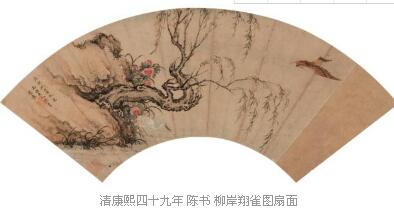 清康熙四十九年 陈书 柳岸翔雀图扇面