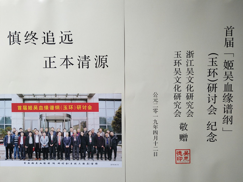 2019年4月12-15日,在浙江玉环召开的“首届姬吴血缘谱纲研讨会”园满成功:取得了共识,明确了方向,成立了机构,部署了今后一段时期的任务。与会人员一致认为: 浙吴会能牵头做这件事确实不容易!任务重,压力大;时间长,难度大;资料难找,工作量更大。这件事做好了,真是功德无量,永垂青史。