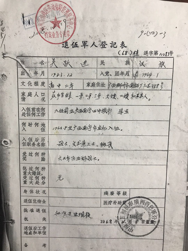 入伍后我们到百色市新兵连去集中训练,经过三个月的新兵训练而后分配到连队去工作。连队的生活是艰苦的也是快乐的,每天6点钟起床,全副武装集体跑四公里回来才吃早餐。尽管训练很艰苦,但觉得生活很有意义,也很快乐,那时我才18岁不知道什么叫苦和累。上午是军事训练,下午是政治学习,夜里经常进行紧急集合到20公里外的山林里去捡蒋介石飞机空投下来的反动传单。这些紧张快乐的军旅生活不知不觉地就过去了6年,而后依依不舍地退出现役回到地方参加工作。
