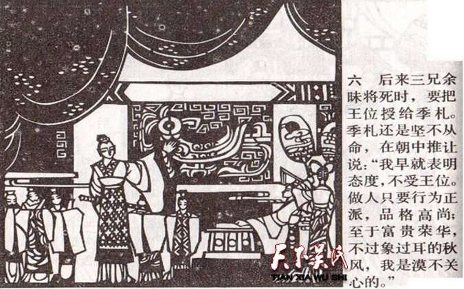诸樊服丧期满,又要把王位传给季札。季札用昔日曹国子臧逃离曹国不接受王位的典故,表示自己虽然不才也要学习先贤,严守节操,再次拒绝了吴王位。诸樊不死心,为了早日把王位传给季札,在率军攻打楚国的时候,身先士卒,被楚将射死。临死前嘱托二弟余祭,一定要将王位传给四弟。又把季札封在延陵(现江苏常州),于是人们称他为“延陵季子”。余祭也学习大哥好榜样,亲自率军攻打越国,获胜回国时,在船上被越俘刺杀身亡,实现了早死的愿望。老三余昧依次当立,又要把王位让给季札,季札再次坚决辞让。余昧临终又要把王位传给季札,季札坚决推脱,再次重提曹国子臧的事例,说道:“我早就说过不要王位了。做人追求的是品行高洁,待人处事讲究仁义。至于荣华富贵,不过象耳旁吹过的秋风,我是毫不关心的。”于是他逃到了封地延陵。余昧的儿子州于继位为王,号称吴王僚。后来王僚被公子光刺杀后,他又假惺惺地表示要把王位让给季札,季札更不能接受了,于是跑到延陵终身不再到吴国的都城。这就是季札四让王位的故事。孔子对季札推崇备至,亲自在他的墓前题辞:“呜呼有吴延陵君子之墓”。季子不愧为泰伯、仲雍之后“至德”第三人!