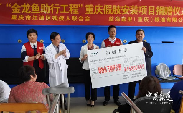 中国报道讯 (李博 重庆报道 通讯员 李定超)在第29个全国助残日到来之际,益海嘉里(重庆)粮油公司向江津区残疾人朋友献上了在份厚礼——捐赠人民币45.8万元。5月11日,捐赠单位在重庆市康复辅具技术中心举行了捐赠仪式,江津区残联主要负责人一行参加了仪式,并接受了捐赠。