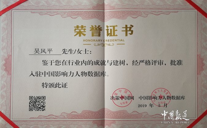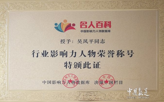 近日,经过国家决策中国网,中国影响力人物数据库严格评审筛选,吴风平院长被批准入驻“名人百科”中国影响力人物数据库,并颁发了入驻证书。