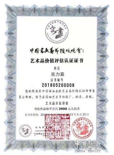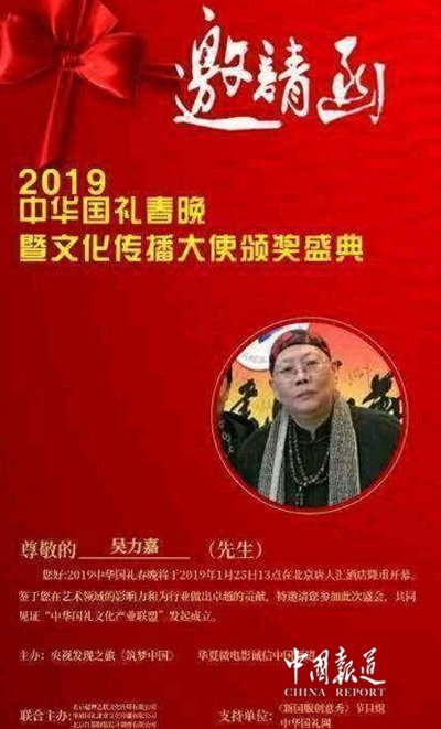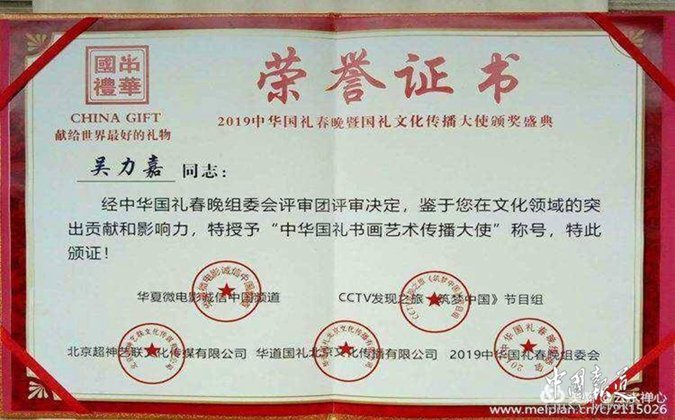 2019年1月,荣获CCTⅤ中华国礼“书画艺术传播大使"荣誉称号。2019年5.18CCTⅤ于广州"商企汇"携手同行,获得“公益形象推广大使"荣誉称号。老吳2018参加中国北京首届书画春晚悬腕书法表演″家和万事兴"获得十大书法家荣誉称号!得到了多家媒体支持,网络直播平台和电视视频支持,现已成为"网红名人"。