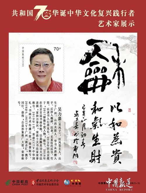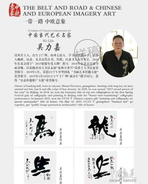 央视新闻快讯:日前,央视获悉,5月28号非常吉祥如意鸿运当头大喜日子里迎来中国著名书画名家吴力嘉大师双喜临门的好日子,国际邮册与中国邮票管理局发布吴力嘉大师作品更加让广大朋友深入了解吴力嘉大师在书画方面的知明度。吴力嘉(吴风子),汉风堂主人,出生于广州,山西太原人。学书从唐楷入手,后涉入魏碑,汉隶,尤喜汉代帛书,竹简,以隶书入行草见长。2018年在北京授于″2017骄傲年度人物″称号。2018年在北京首届书画春晚,以悬腕真功夫书法表演"家和万事兴"荣获十大书法家荣誉称号。2019年1月,荣获CCTⅤ中华国礼“书画艺术传播大使"荣誉称号。