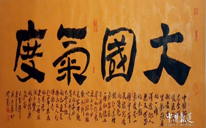 主题:四个字《大国气度》,落款小字是:"中国始终是全球发展的贡献者,这里彰显着的是一种泽荫他人,惠及世界的大国气度,一种中华民族优秀的传统标记,这种气度是一种胸怀,不是沽名钓誉的作秀,更不是自吹自擂的狂欢,亦或是坐井观天的妄自尊大,而是大而不骄的仁爱,是推己及人的谦逊,是包罗万象的宽厚,更是一种波澜不惊的自信与从容。己亥年夏月吴力嘉书于莞(东莞的简称)。