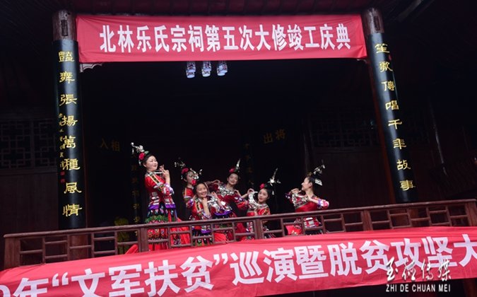 当天,天柱县宣传部、县文广局利用宗祠庆典良机,组织开展“天柱县2019年文军扶贫巡演脱贫攻坚大宣讲活动”,20多个精彩的节目为宗祠庆典添加了脱贫攻坚的时代气息,深受乐氏族人喜爱。