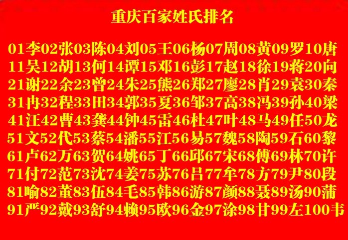 壁山区十姓:张、陈、王、刘、李、周、杨、黄、赵