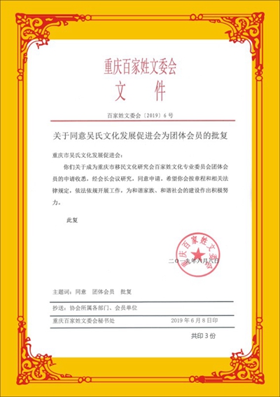 据介绍全国各地省市均成立有吴氏宗亲会组织,唯独长江上游地区直辖市重庆成为空白,据介绍,重庆吴氏文化发展促进会是经重庆市百家姓氏文化交流会批准(2019)6号目前重庆市百家姓氏文化交流会审批极为严格,每年仅有几个姓氏名额获审批。