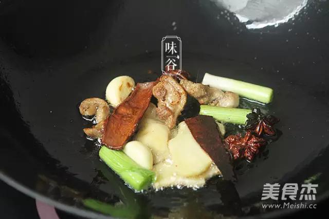 4.煸出油后倒入八角、桂皮、蒜、姜片、葱白,炒出香味