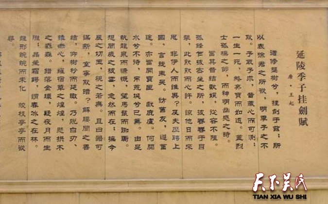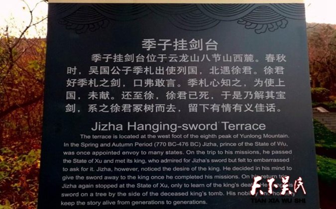 季子挂剑台在徐州云龙山西坡杏花村内,石坊横额上镌刻着“季子挂剑台”。拾级而上,登临高台,徐君墓前有大青石长碑,上刻一联:延陵季子兮不忘故,脱干金剑兮挂丘墓。在墓冢旁筑有碑亭,铭刻着挂剑的故事。景墙两側镶嵌着题刻:“挂剑酬心,践信泉台。”挂剑台作为诚信的象征,是友情与仁义的丰碑,表明了古人对情、对意、对诚实、对诚信的一种珍视。