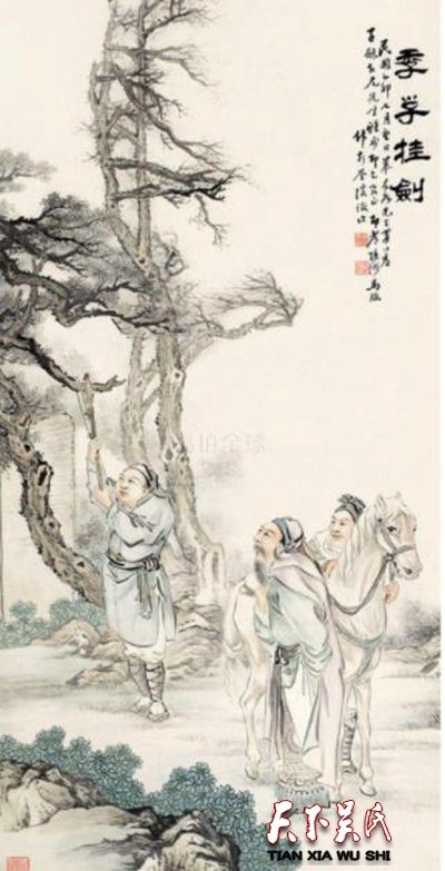 中国有句俗语:“人在人情在,人不在断往来。”季札的行为,表现了对友情的坚定,一诺干金,生死不逾。何况,这许诺还没有付诸言语,变成契约呢!季札挂剑行为获得了徐国人的赞赏,遂作《徐人歌》唱道:“延陵季子兮不忘故,脱千金之剑兮挂丘墓。”明代诗人杨于臣有《咏睢宁》诗日:“季札报徐君,冢树挂剑锋。至今泗水南,高台遗芳踪。”清代状元李蟠(徐州人)有诗日:“斯事何关物有神,交情赖此尚留真。三朝仍自称公子剑安能负故人。国乱先机脱匕首,君仇遗恨失延津。匣中午亦有吴钩在,酹酒西风看几巡。”唐代诗人杜甫在《哭李尚书》一诗中有这样两句:“欲留挂徐剑,犹回忆戴船。”宋代诗人黄庭坚《李濠州挽词》咏也有句:“挂剑自知吾已许,脱骖不为涕无从。”