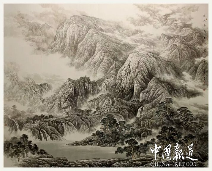 “李光灿的《大三峡》传达出一种大气、苍茫、宁静,并追求以形写神,并从“神”中营造“韵”味。在作品中呈现出虚实相生的自然景象,使画面有新的时代风貌和传统的笔墨韵致……”