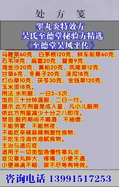 主治与适应症:适用于一切类型急慢性睾丸炎,症见睾丸肿大,疼痛,小便不通,小便淋漓不畅,尿不尽等有特效。