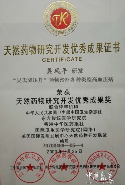 【个人荣誉】国家卫生部授予“中华名医”荣誉称号。联合国国际医科大学、世界自然医学基金会、世界自然医学组织联合授予“人类医药大师”;“世界千年名医”“世界好医师”“杰出贡献奖”。中国企业文化促进会、中国社科院、清华大学、中国国际职业经理人协会联合授予“中国优秀医疗科技工作者”。中国医疗保健国际交流促进会授予“杰出贡献奖”。特邀出席中国名医第四届论坛大会,受到中央领导和国家卫生部领导的表扬和接见;吴风平创办并领导的“安康传统医学研究所”因在科研上取得重大成果,而被评审授予“三星级单位”及“中国优秀职业经理人”称号。中国民营经济研究会、中国最具发展潜力企业高层论坛组织委员会授予“中国最具发展潜力企业”和“中国最具发展潜力企业领军人物”称号。中华中医药学会授予“全国基层优秀中医”光荣称号。吴风平先生的个人事迹被录入《世界名医大典》、《中国中医名人榜》、《中国优秀特色专科名医荟萃》、《中华各界建设先锋人物》《世纪风采人物》等大型权威辞书。