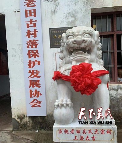 老田吴建村已有2000多年,相传80余代,历史悠久,文化底蕴厚重,与九华山地藏文化渊远流长。“老田吴氏大宗祠”坐落于千年古村落村北首水口园林处,解放前香客游人朝山游览必经的朝圣古石板道西侧。纵观中国的姓氏宗祠,没有一处能与“老田吴氏大宗祠”相提并论,昔日“老田吴氏大宗祠”享堂内悬挂120余块历代皇帝御封赠區,宗祠东侧的“地藏行宫”即今天的“九华行祠”紧依宗祠,共墙通门相存,只在全国所有宗祠之中仅此一处。文化底蕴厚重,故事传奇有趣,独具魅力。昔日但凡文官武将朝圣九华,途径“老田吴氏大宗祠”时,文官需下轿,武官必下马,进行祠、宗祠祭拜后方可上山朝圣,足以见证了“老田吴氏大宗祠”的历史地位和对外影响力。从而更增添了“老田吴氏大宗祠”的显灵度和美誉度,是所有栋材公后裔子孙倍感自豪和珍贵。