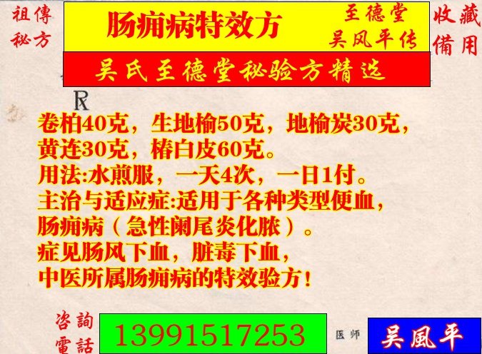 主治与适应症:适用于各种类型便血,肠痈病(急性阑尾炎化脓)。症见肠风下血,脏毒下血,中医所属肠痈病的特效验方!