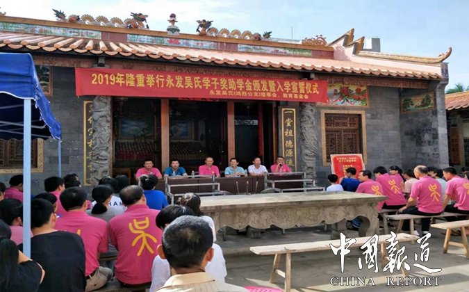 中国报道讯(特约撰稿吴乾山)为弘扬中华传统文化,重教兴邦,促进文明和谐,8月18日,海南省澄迈县永发吴氏(鸿烈公支)理事会,教育基金会,在永发村吴氏宗祠举行吴氏学子,奖助学金颁发暨入学宣誓仪式。来自本支族学子20人得到奖、助学金。其中高考大学录取生4名,初升高,市县重点中学4名,参加全国学科竟赛一、二等奖各1名,小学年级春季期末考试总分前十名2名,资助中小学贫困生10名。