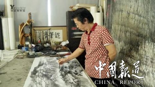中国画《流芳千古》左上角的黄色光线很引人注目。这是吴辉忠在创作过程中的别出心裁。 “在画中出现光源一般是西画才有的体现,我这幅国画的创新之处就在这里。”吴辉忠告诉记者:“光线从高山与高山的狭缝中投射出来的美景,是对祖国大好河山的美好写照,也是改革开放40年来祖国人民沐浴在党的雨露和阳光中的隐喻。” “你画过的纸叠起有多高,你的程度就有多高。”