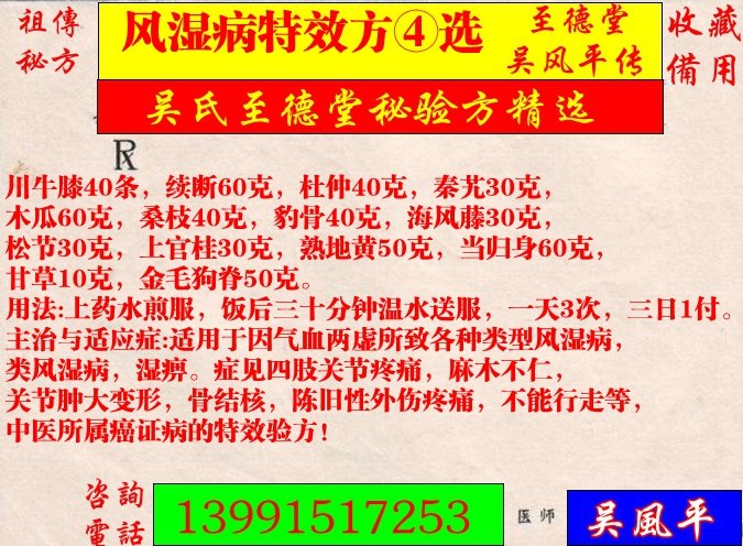 主治与适应症:适用于因气血两虚所致各种类型风湿病,类风湿病,湿痹。症见四肢关节疼痛,麻木不仁,关节肿大变形,骨结核,陈旧性外伤疼痛,不能行走等,中医所属癌证病的特效验方!